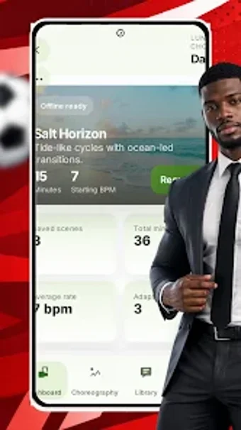 Lungscape Choreo é um aplicativo disponível para Android que serve como um cronômetro para exercícios de respiração, permitindo que os usuários sincronizem sua respiração com paisagens virtuais. A interface do aplicativo é composta por um painel que apresenta estatísticas e ações rápidas, facilitando a navegação e o uso. Os usuários podem configurar e visualizar exercícios de respiração na aba de Coreografia, que inclui diversas paisagens cênicas para uma experiência imersiva.